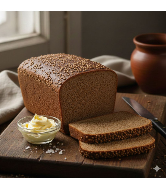 Experience the deep, complex flavors of authentic Borodinskiy bread. This premium dark rye loaf is crafted using a time-honored multi-stage scalding process. The addition of aromatic rye malt gives it a characteristic dark color and rich aroma, while a topping of whole coriander seeds provides its iconic spicy finish. A dense, nutritious, and flavorful choice for those who appreciate high-quality artisanal baking.